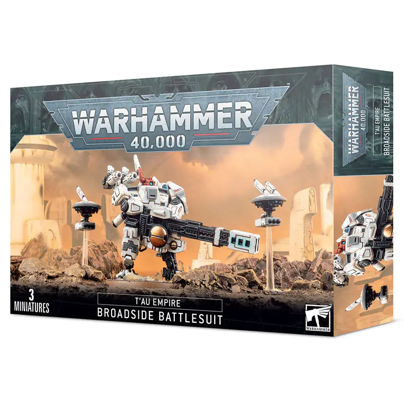 This multi-part plastic kit contains 91 components and a T’au transfer sheet with which to make a Broadside Battlesuit and two Drones.